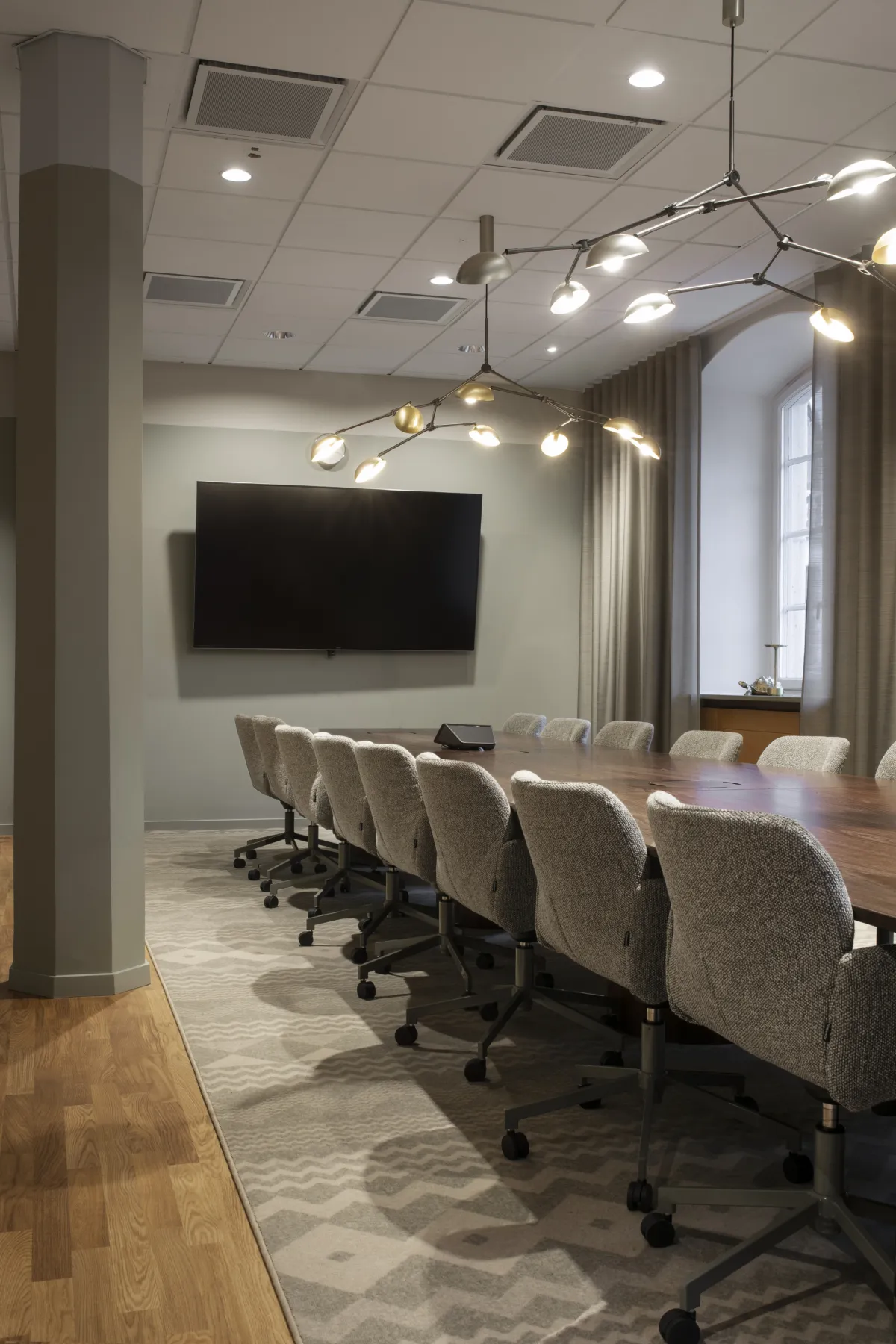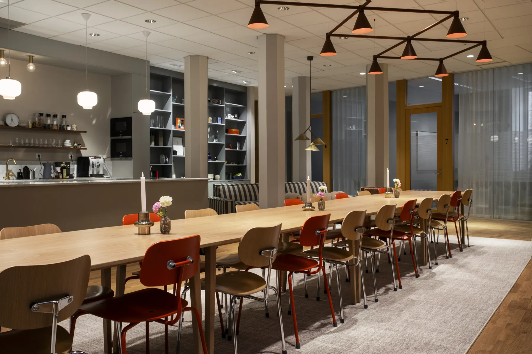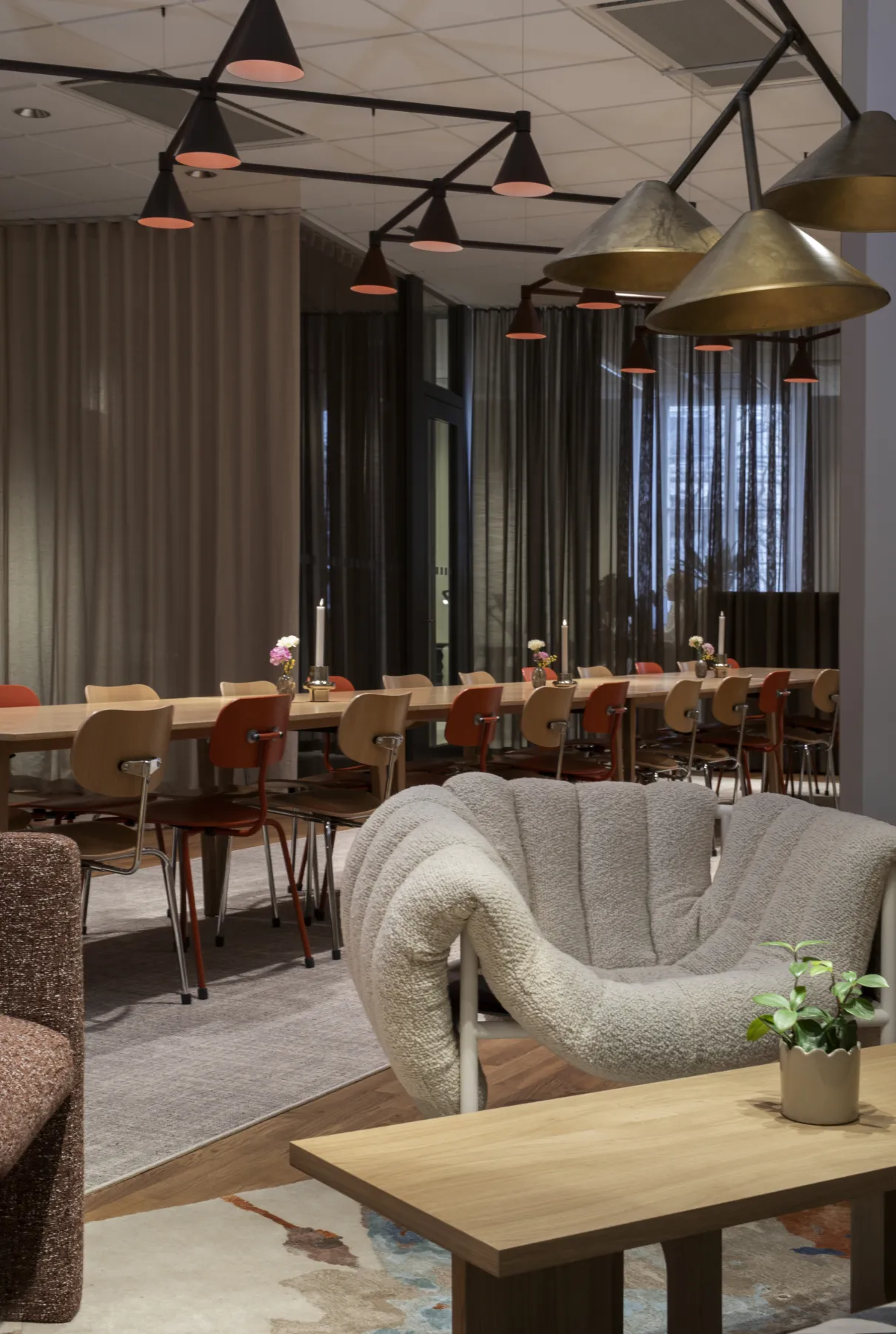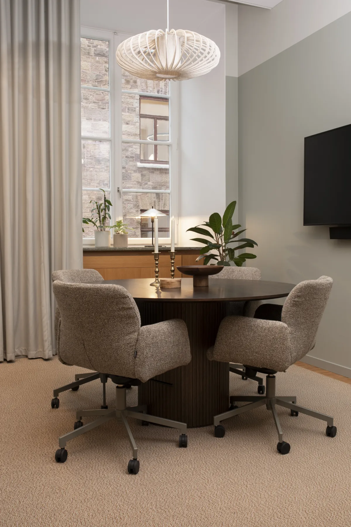 När koncept och idé var utformade hjälpte vi till att göra verklighet av det genom inköp och leverans av all lös inredning. I matsalen behölls stolarna, men kompletterades med nya stolar i samma stil och en specialritad taklampa som bidrar till rumsskapandet beroende på höjd. Inredningen generellt skulle vara lite eklektiskt där gammalt samsas med nytt och kännas hopplockad över tid. Den platsbyggda hyllan i entrén förstärker hemmakänslan direkt man kommer in. En plats där historien om dem och deras portföljbolag kan berättas med små artefakter och föremål.