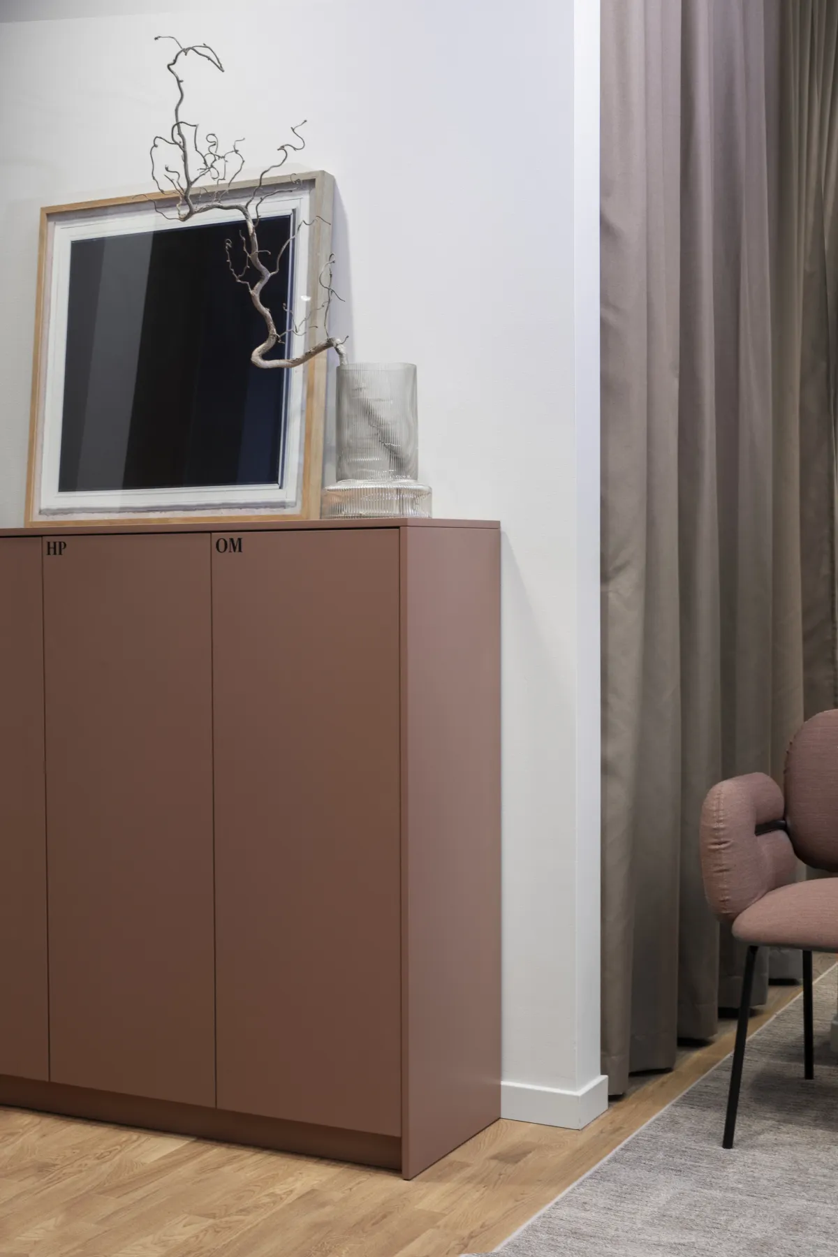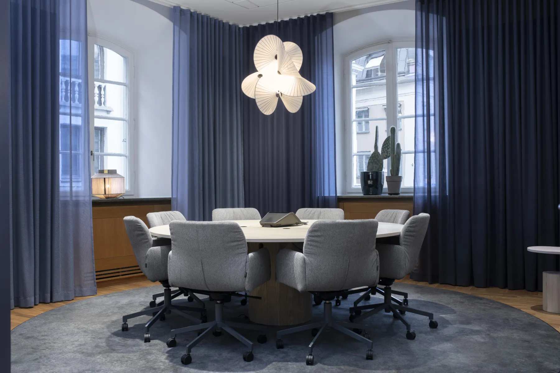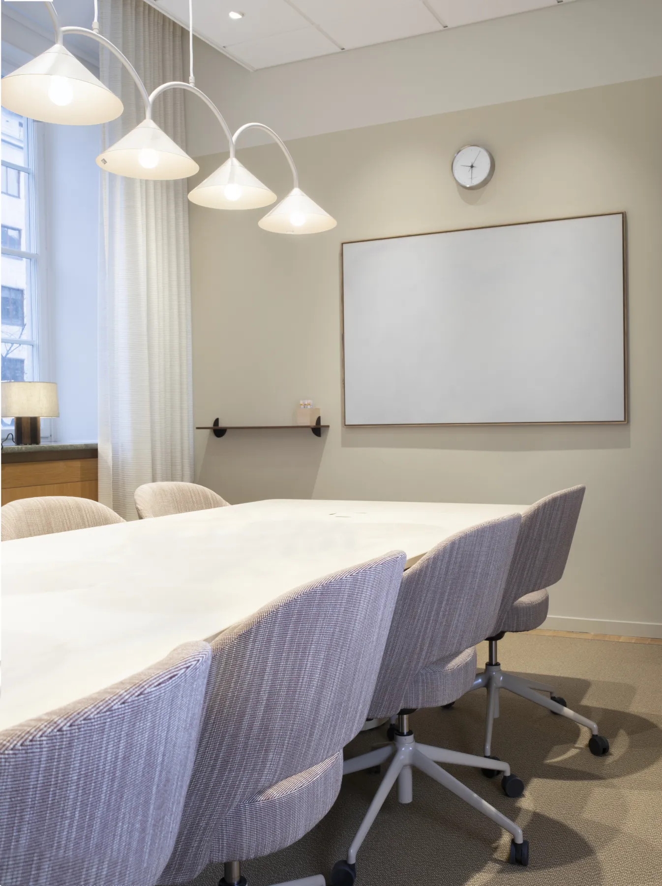 När koncept och idé var utformade hjälpte vi till att göra verklighet av det genom inköp och leverans av all lös inredning. I matsalen behölls stolarna, men kompletterades med nya stolar i samma stil och en specialritad taklampa som bidrar till rumsskapandet beroende på höjd. Inredningen generellt skulle vara lite eklektiskt där gammalt samsas med nytt och kännas hopplockad över tid. Den platsbyggda hyllan i entrén förstärker hemmakänslan direkt man kommer in. En plats där historien om dem och deras portföljbolag kan berättas med små artefakter och föremål.