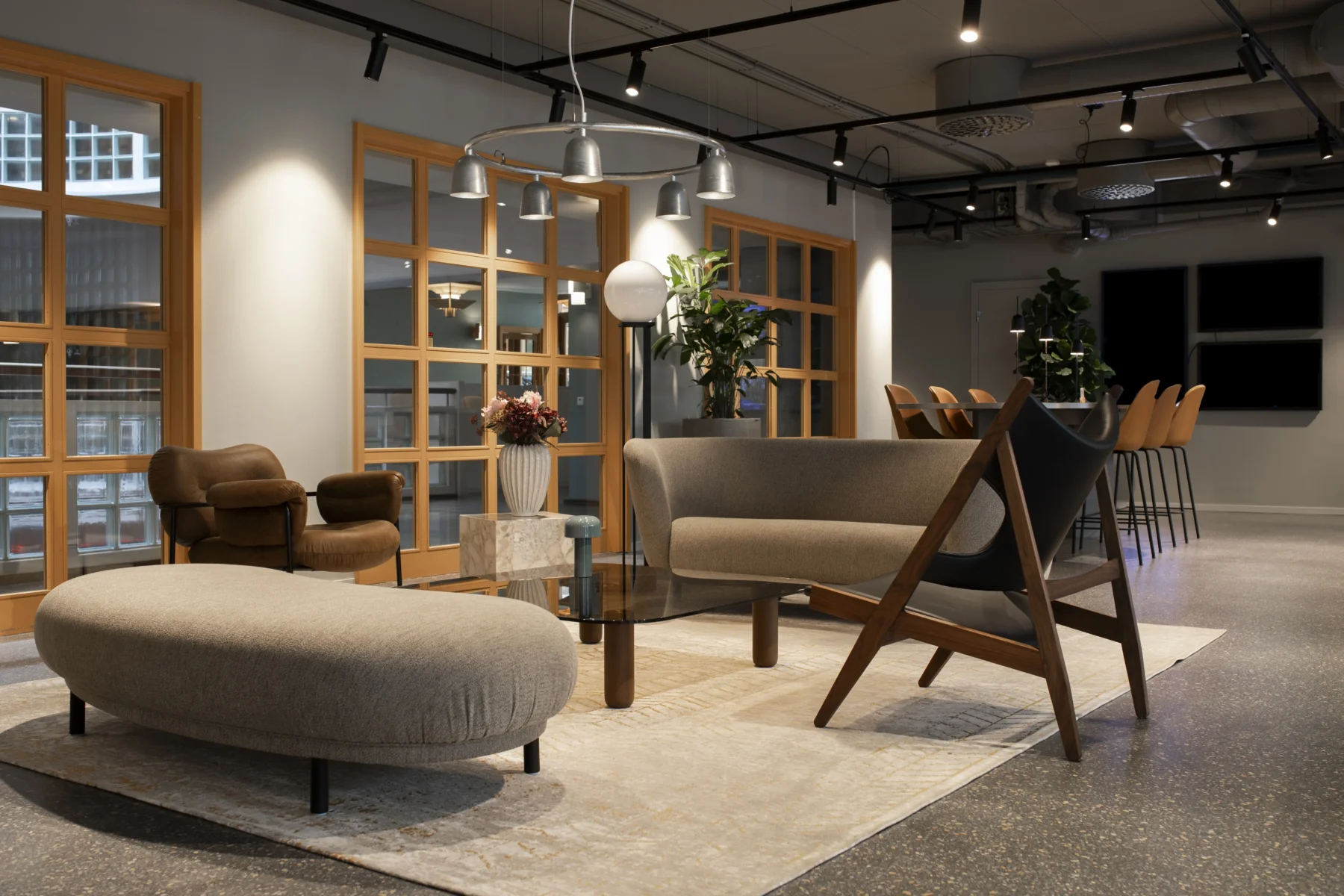 Vi levererade specialsnickerier i form av receptionsdisk, touch down-bord och matsalsbord, belysning och all lös inredning – så mycket som möjligt genom återbruk. Och som kuriosa kan vi berätta att ett av borden är helt gjort av återbrukade nylonstrumpor.